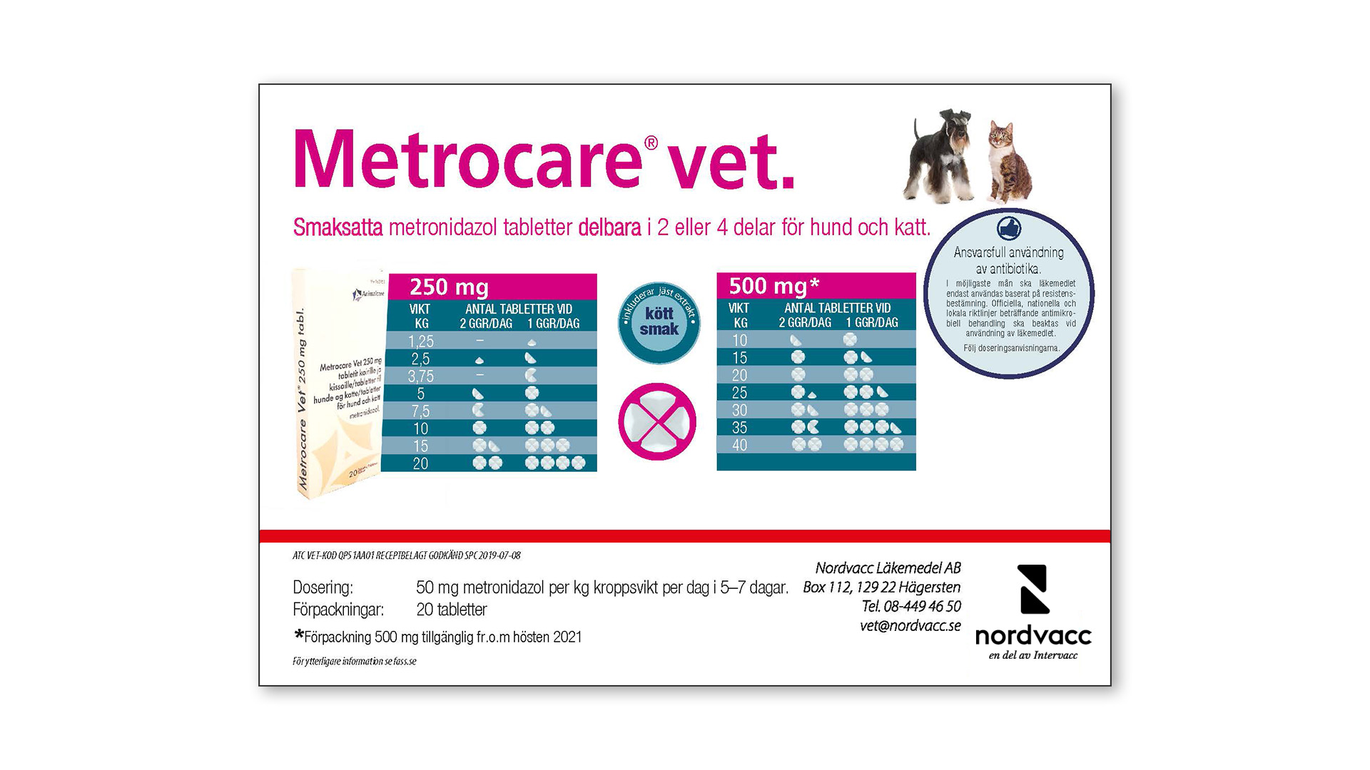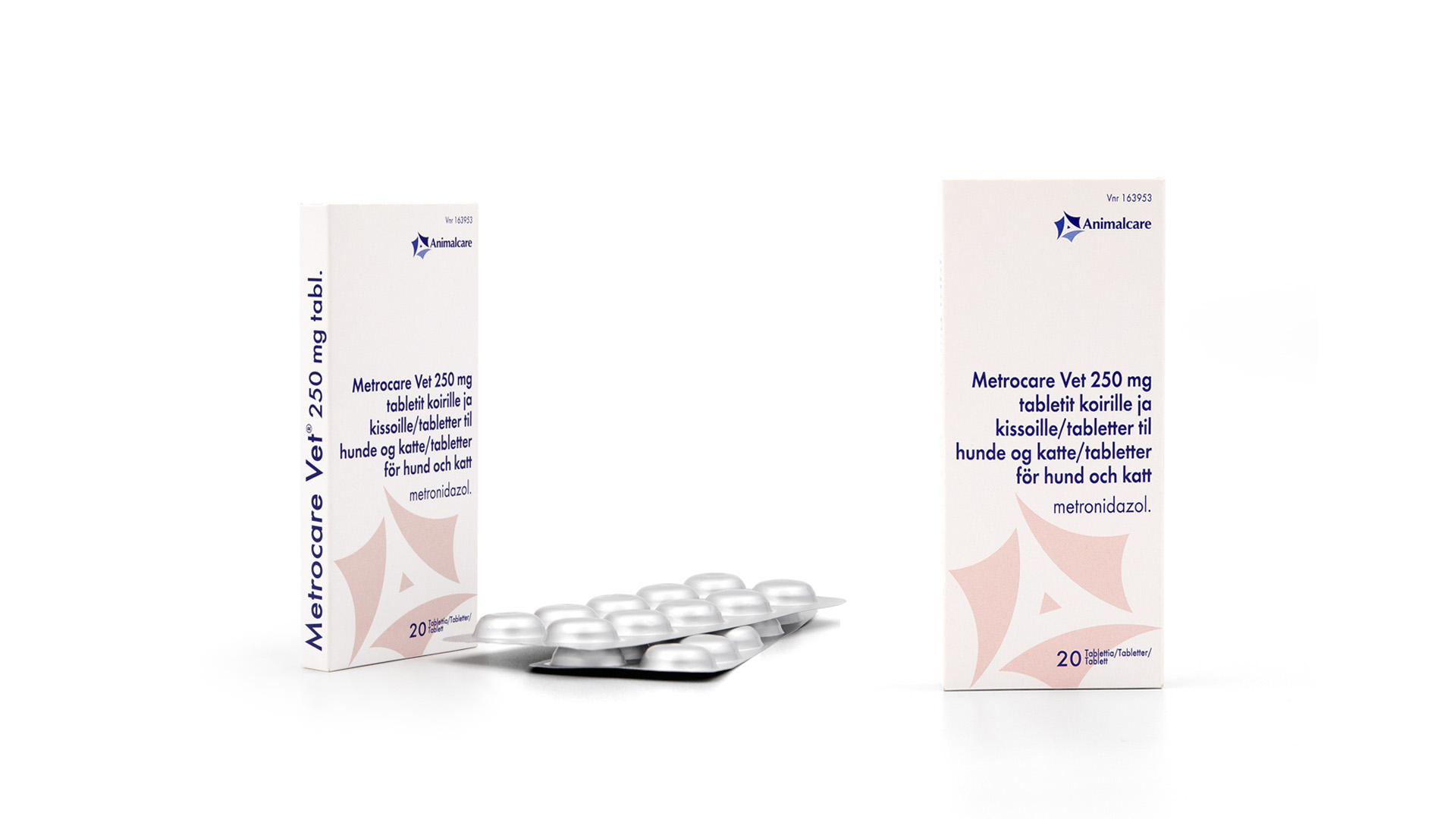 Metrocare® vet. är smaksatta metronidazol tabletter delbara i 2 eller 4 delar för hund och katt. För behandling av gastrointestinala infektioner orsakade av Giardia spp. och Clostridia spp. (dvs. C. perfringens eller C. difficile). Behandling av urogenitala infektioner samt infektioner i munhåla, svalg, och hud orsakade av strikt anaeroba bakterier (t.ex. Clostridia spp.) känsliga för metronidazol.